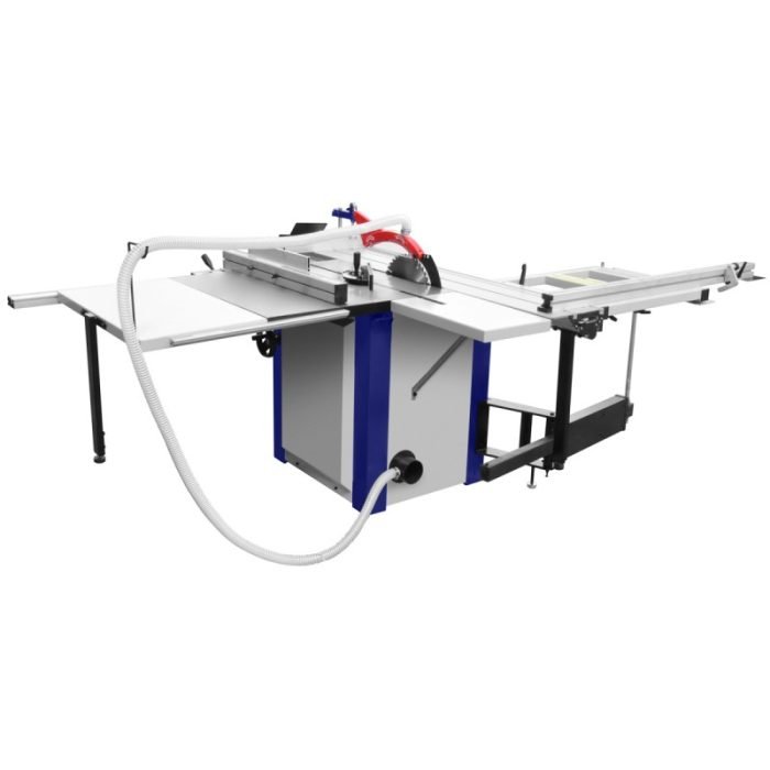 Scie à format Cormak PS12E-2000 avec table coulissante, lame de scie pivotante. Triphasé 400v, longueur de la table: 2000 mm. Lame de scie circulaire pivotante et réglable en hauteur avec unité de coupe. Table en fonte grise avec rallonge de table à l’arrière et à droite avec pied d’appui.